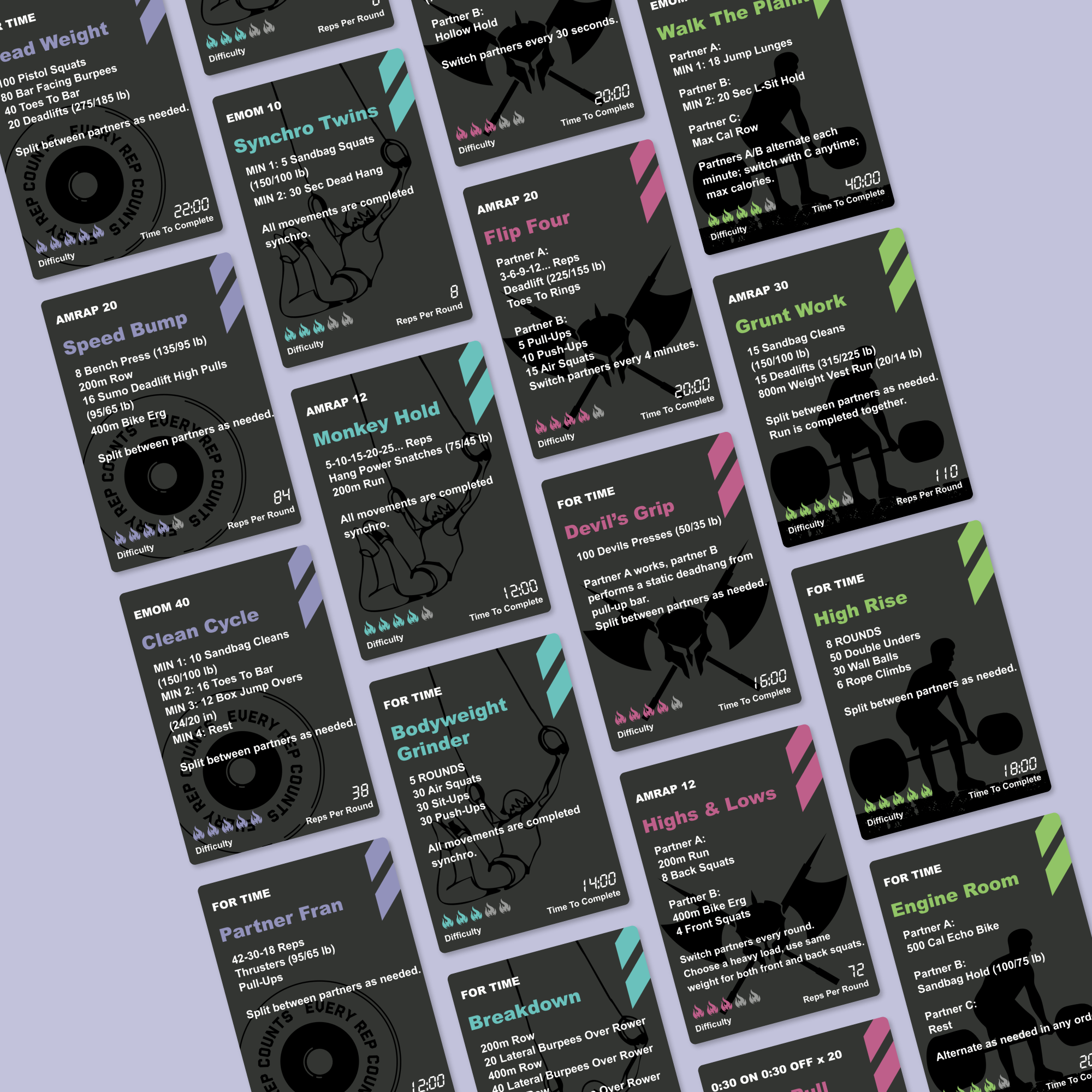 The WODBumP Partner WOD Deck features 52 partner workouts ranging from beginner to advanced. The deck is divided into four categories: you go I go, partner synchro, flip flop, and team of three.