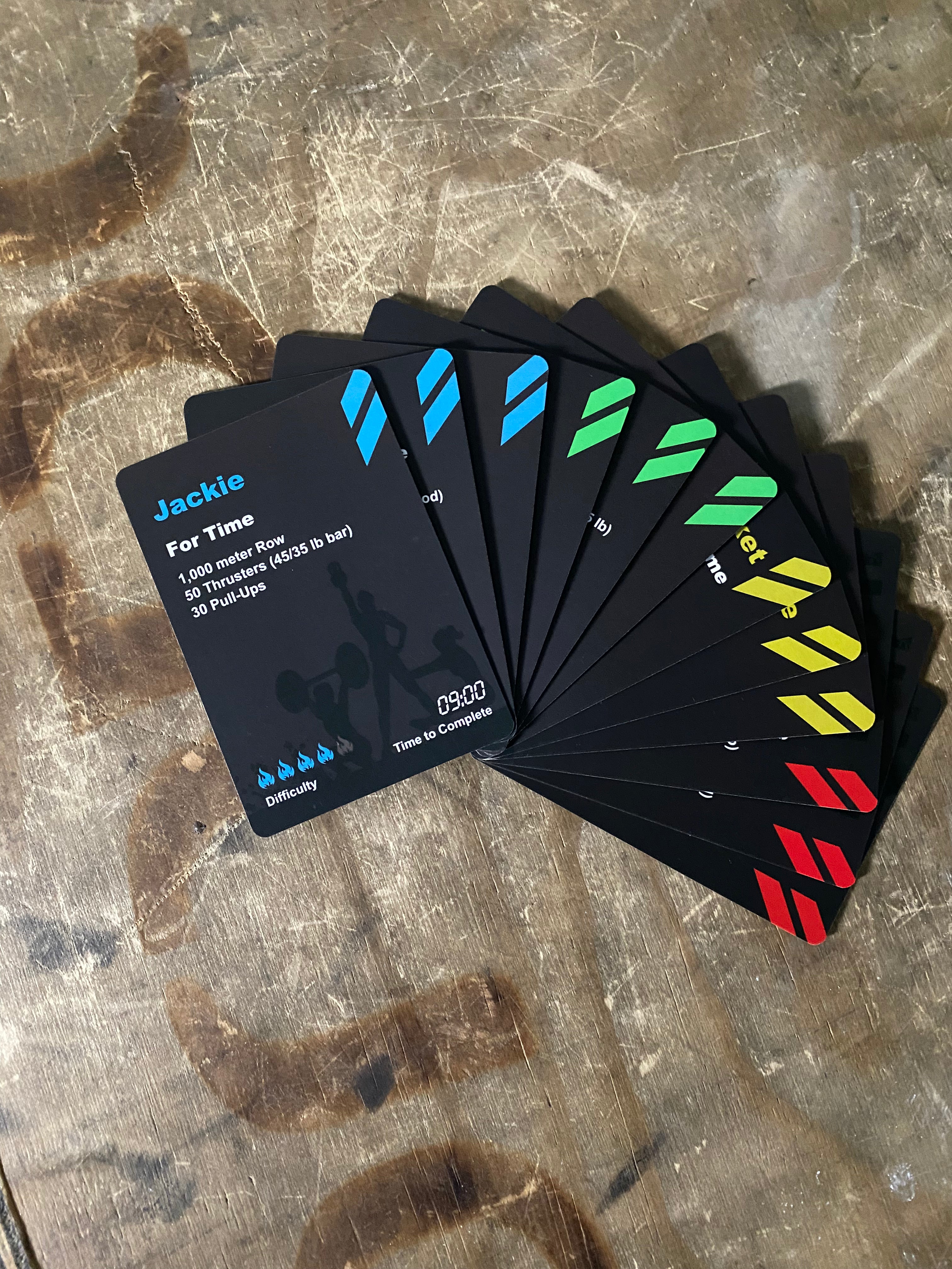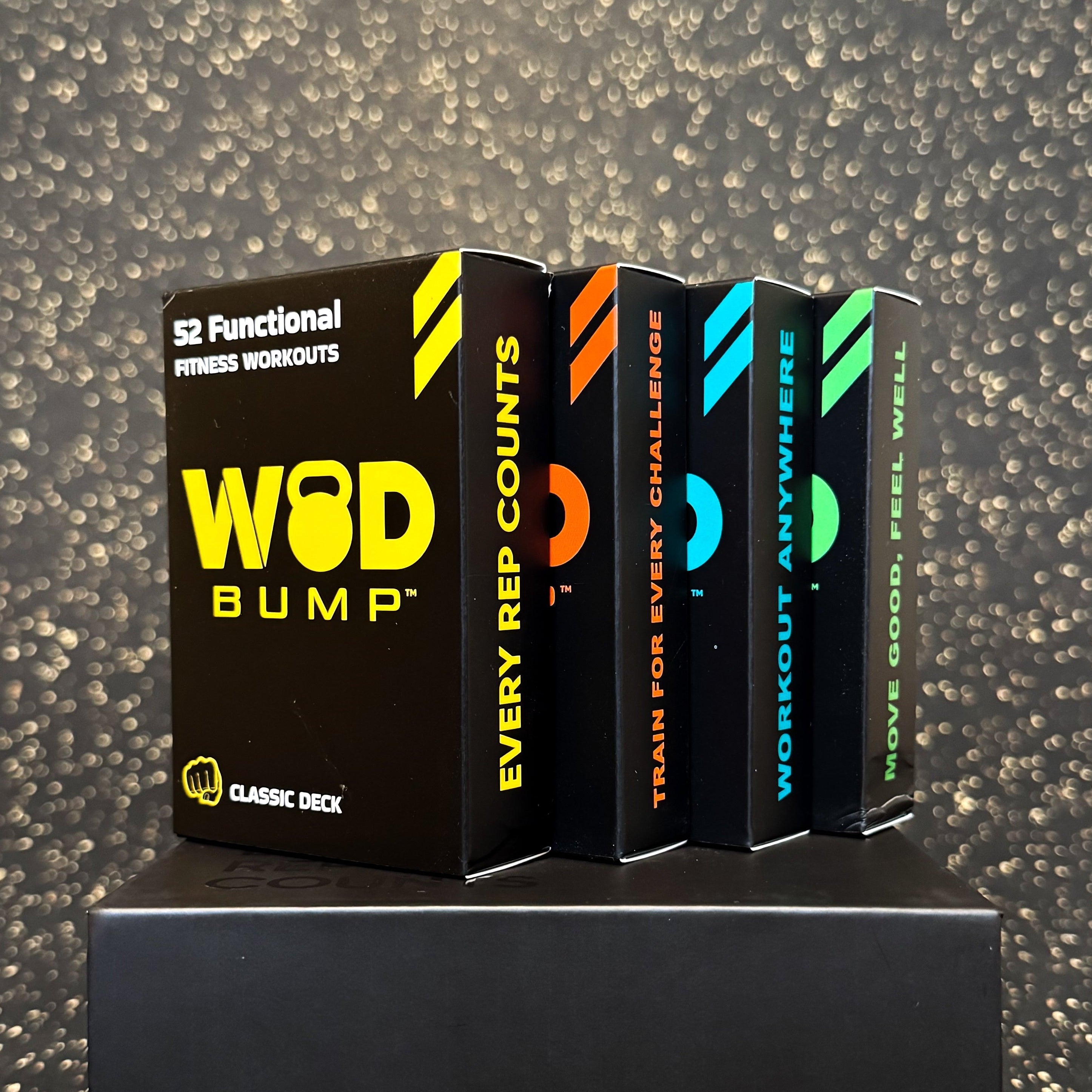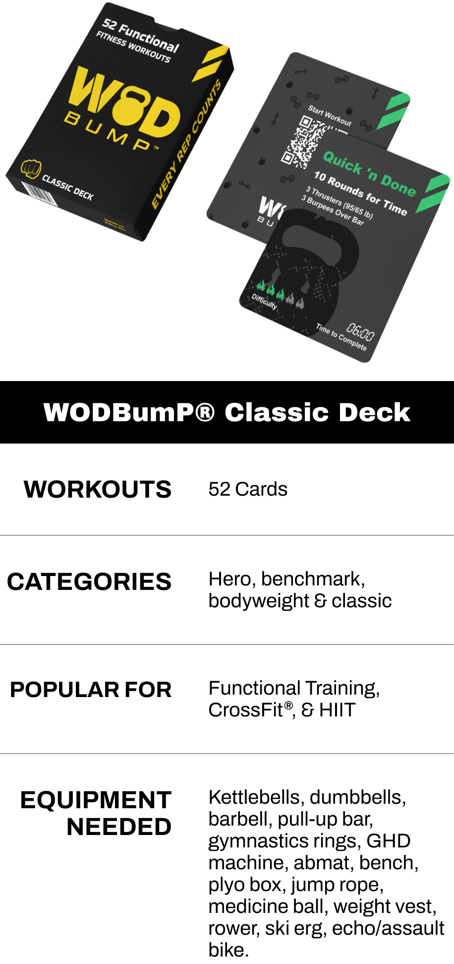 The WODBumP Classic Deck features 52 functional fitness workouts ranging from beginner to advanced. The deck is divided into four categories: hero WODs, benchmarks, bodyweight, & classics.