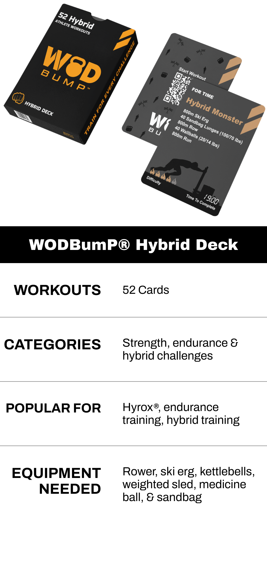 The WODBumP Hybrid Athlete Deck features 52 Hyrox-style workouts designed to help you prep for your next race. The deck is divided into three categories: strength, endurance, & hybrid challenges.