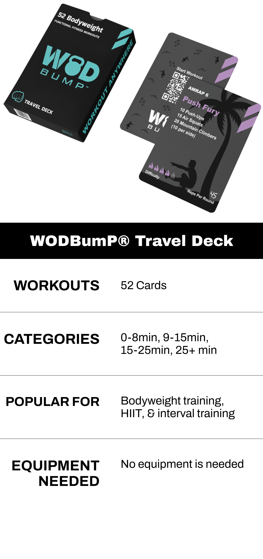 The WODBumP Travel Deck features 52 no-equipment functional fitness workouts. The deck is divided into four time-based categories: sub 8min, 9-15min, 16-25min, 25+min.
