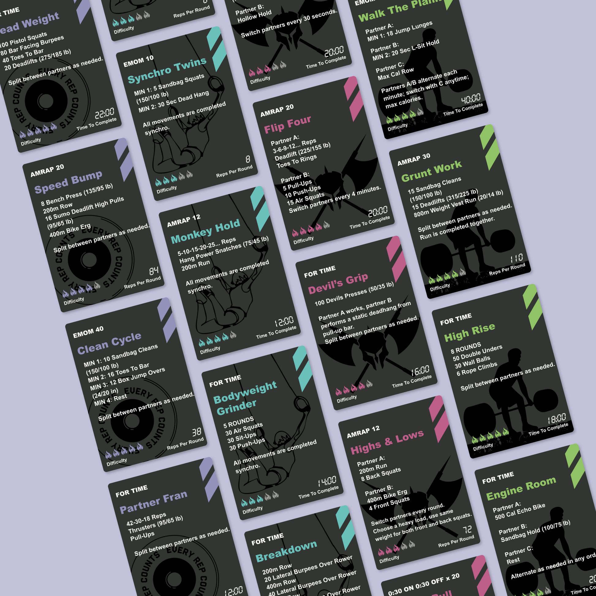 The WODBumP Partner WOD Deck features 52 functional fitness workouts designed to be completed in teams of two or teams of three. Enhance your training while working out with a friend! Each card displays a difficulty rating (1–5), estimated time to complete, and a unique QR code that opens the workout timer and score tracking in our companion app.